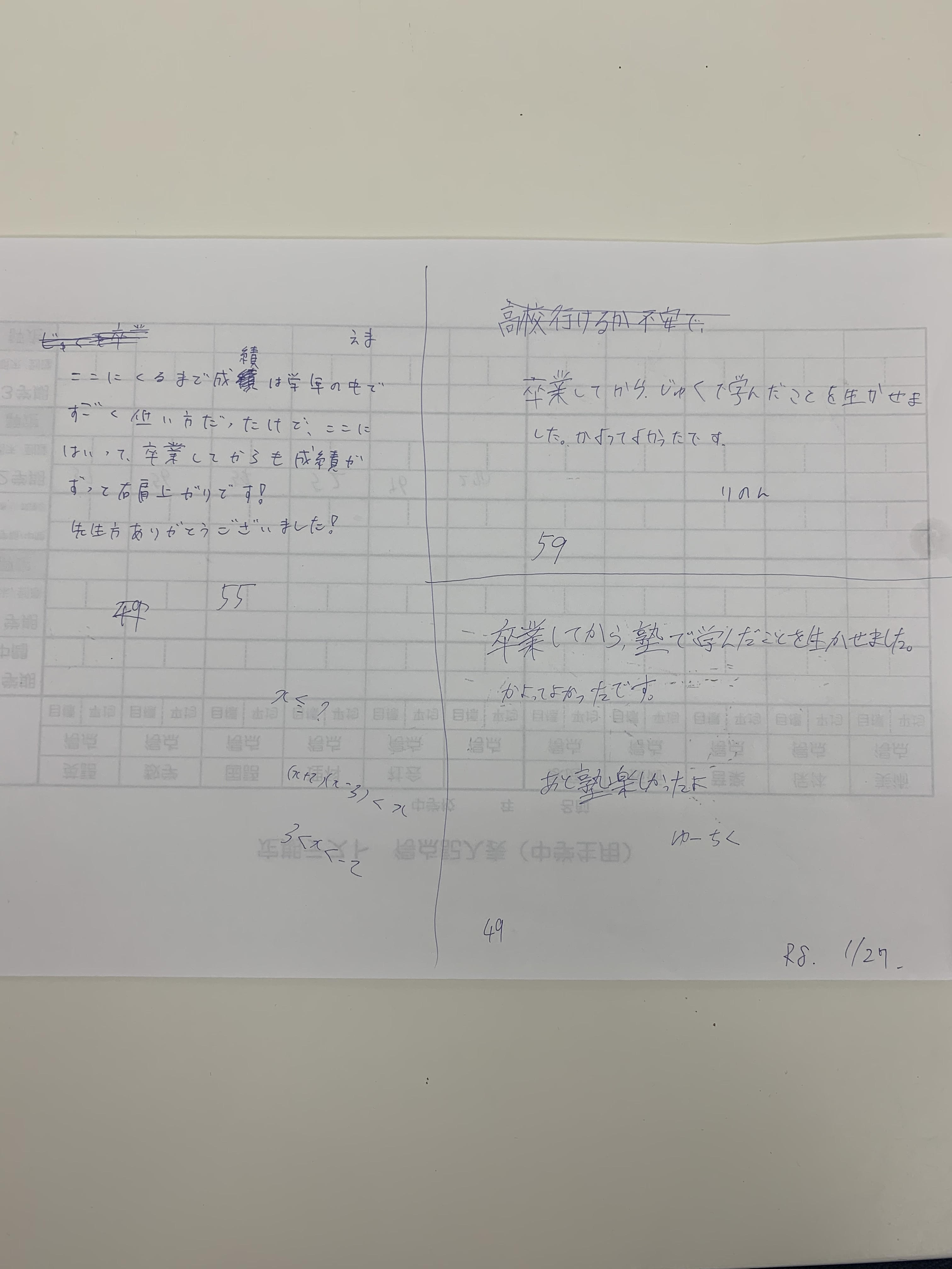 「テストの点数や成績(社会 学年トップ)も右肩上がり」と嬉しい報告もあり、講師一同とても励みになりました。