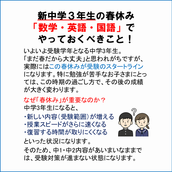 春休みは、「これまでの総復習に集中できる最後のタイミング」です。