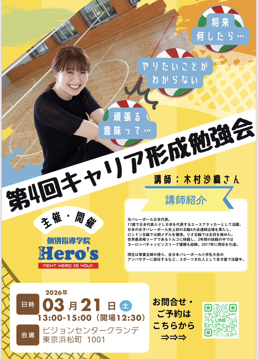 元バレーボール女子日本代表であり、オリンピック4大会連続出場という輝かしい実績を持つ木村沙織さんを講師に迎え、「やりたいことがわからない」「将来に不安を感じている」といった悩みに向き合う時間を提供します。